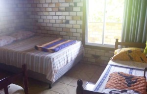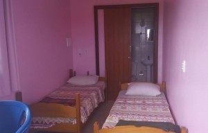 Quarto (duas camas de solteiro) com banheiro.